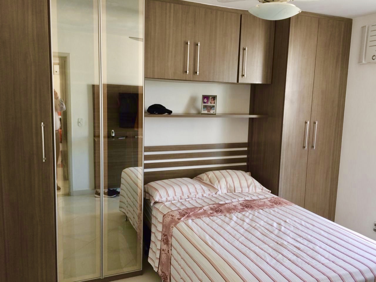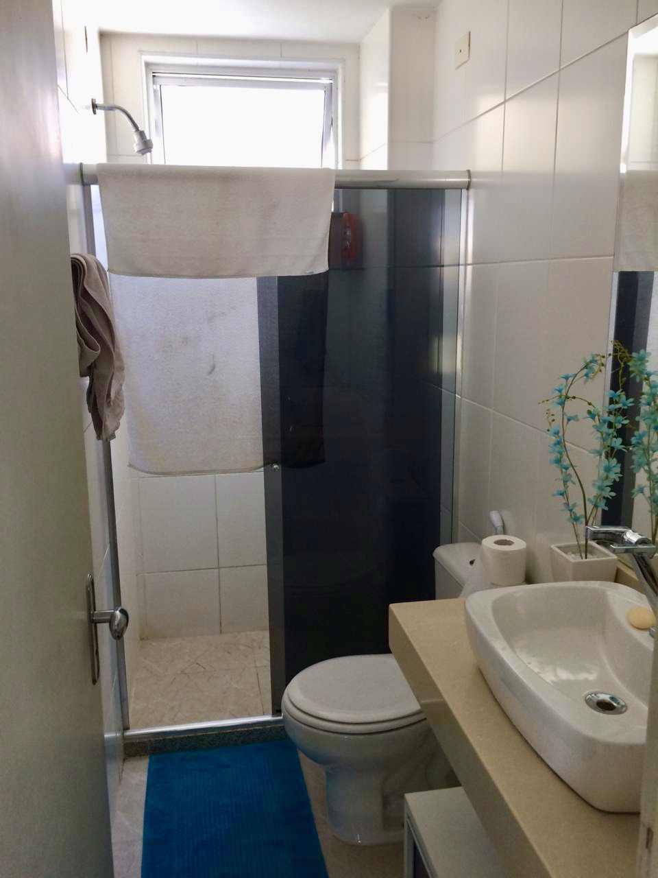 2 quartos convencionais e 1 suíte com armários embutidos e rack de TV, banheiro com Box Blindex e gabinete de pia completo;